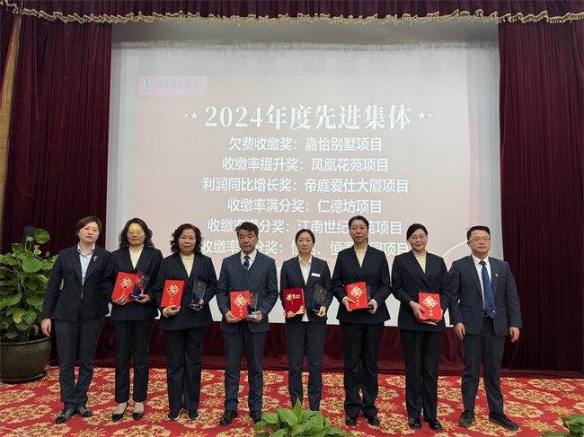 2024年度先進集體(單項)頻效獎:嘉華山莊項目、人效獎:上海大花園項目、欠費收繳獎:嘉怡別墅項目、收繳率提升獎:鳳凰花苑項目、利潤同比增長獎:帝庭愛仕大廈項目、收繳率滿分獎:江南世紀新苑項目、仁德坊項目、恒達恒泰項目